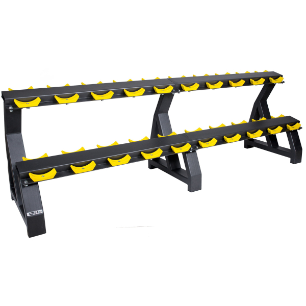 Стойка для гантелей (на 10 пар) представляет собой сборную металлическую конструкцию с двумя полками и ложементами для хранения и удобного использования круглых гантелей.