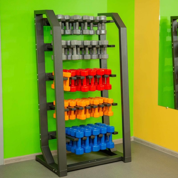 Описание: Стойка для гантелей (на 60 пар, вертикальная) представляет собой сборную металлическую конструкцию для хранения и удобного использования виниловых гантелей.