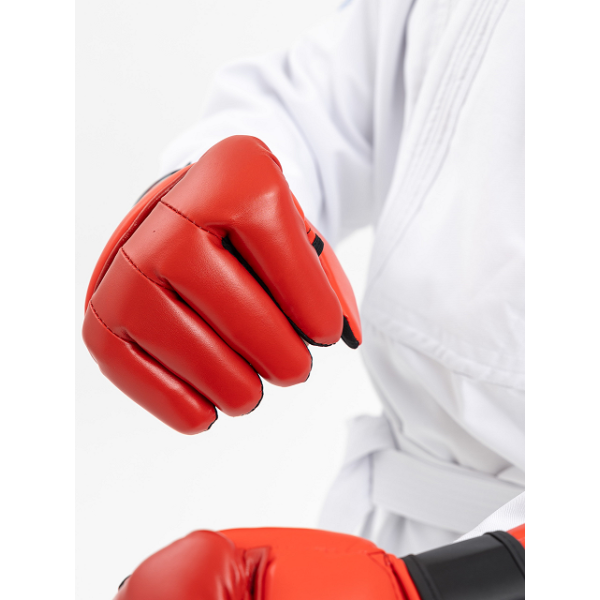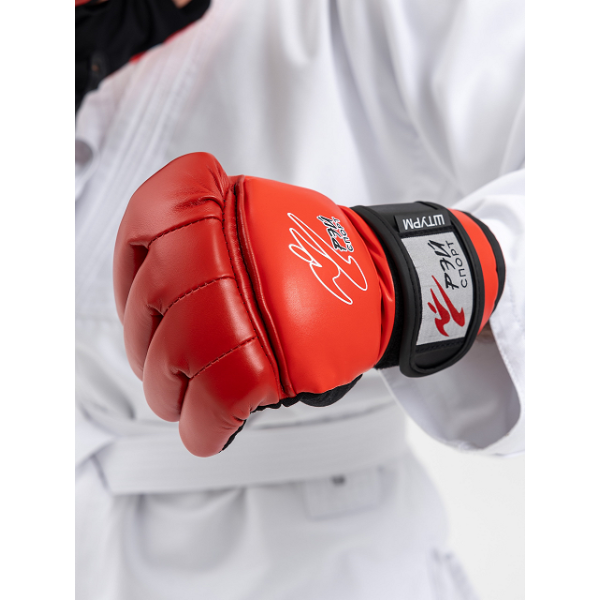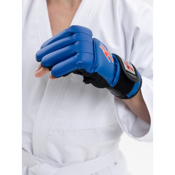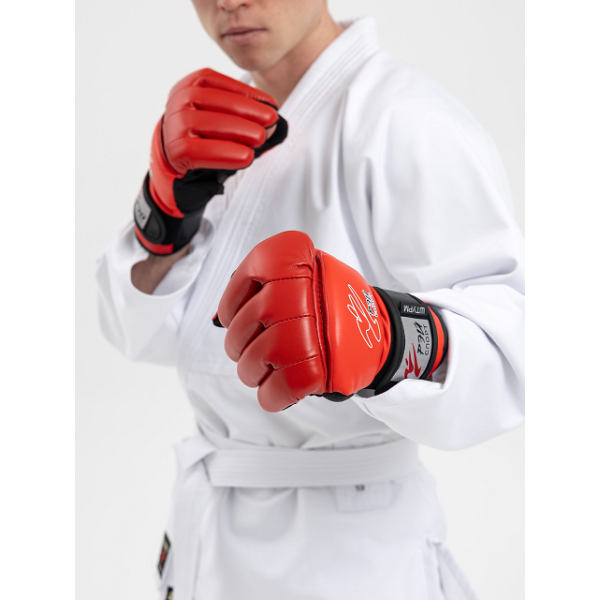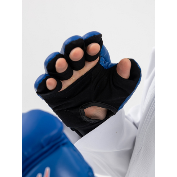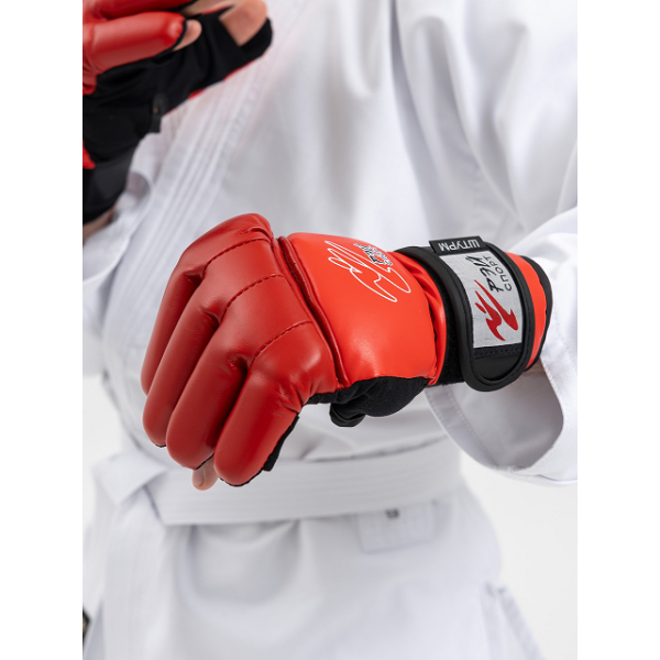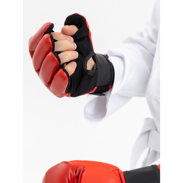 Благодаря ряду уникальных конструкторских решений, примененных в этих перчатках, рука спортсмена надежно защищена в том числе и при ударах о металлическую маску. Высокая степень подвижности открытых пальцев позволяет применять бросковую технику в полном объеме. На ударной поверхности со стороны большого пальца имеется ярко выраженный выступ для дополнительной защиты суставов.