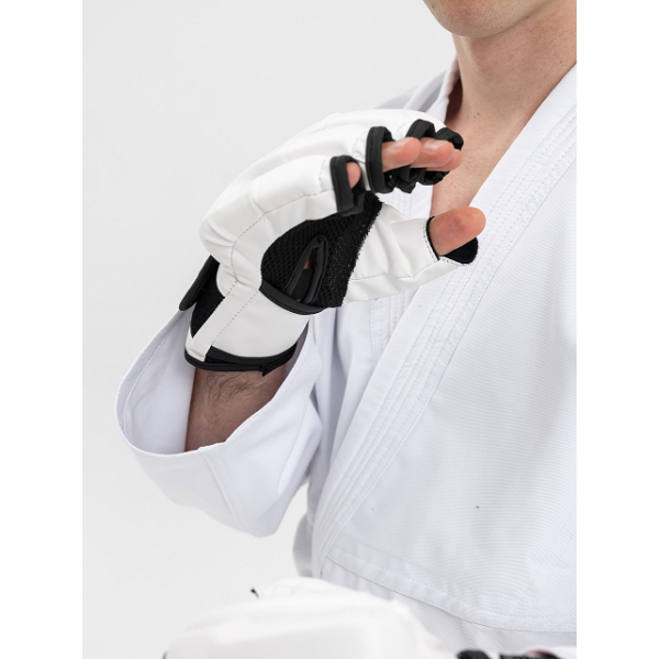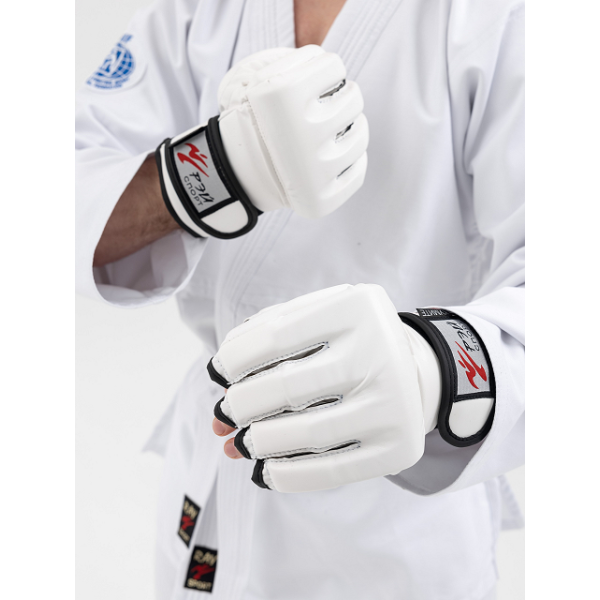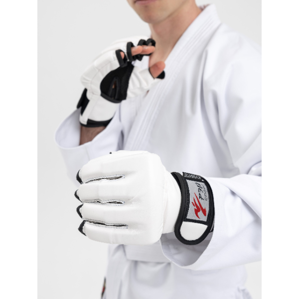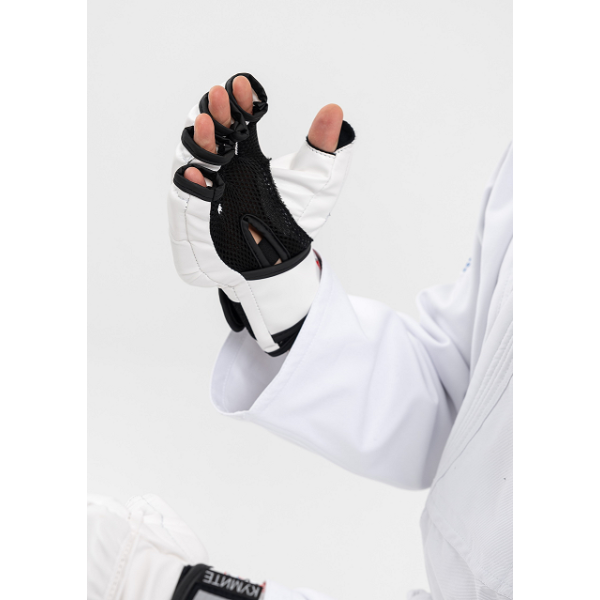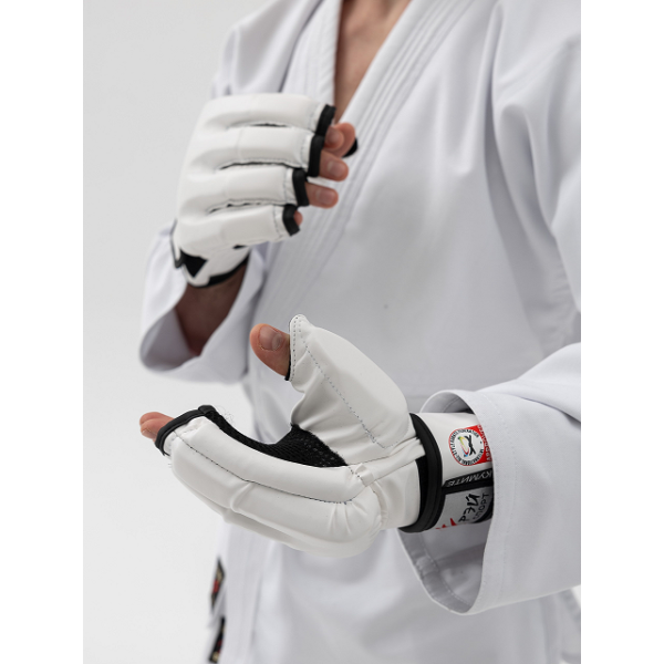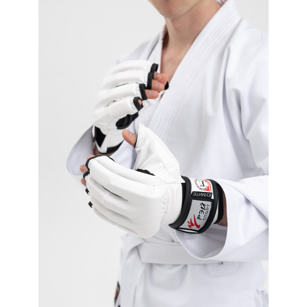 Перчатки для единоборств КУМИТЕ одобрены Федерацией Всестилевого каратэ России (ФВКР) и Международной федерацией Всестилевого каратэ (IASKF) и рекомендованы к использованию на соревнованиях всех уровней. Перчатки плотно фиксируются на запястье с помощью широкой манжеты c застежкой Velcro.На манжете перчатки нанесен значок допуска Международной федерации Всестилевого каратэ.