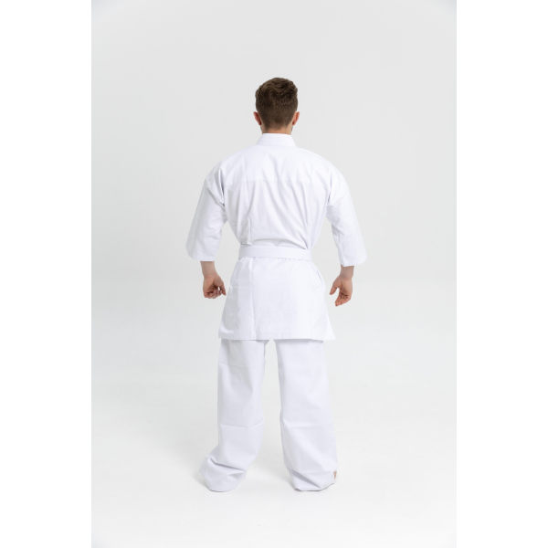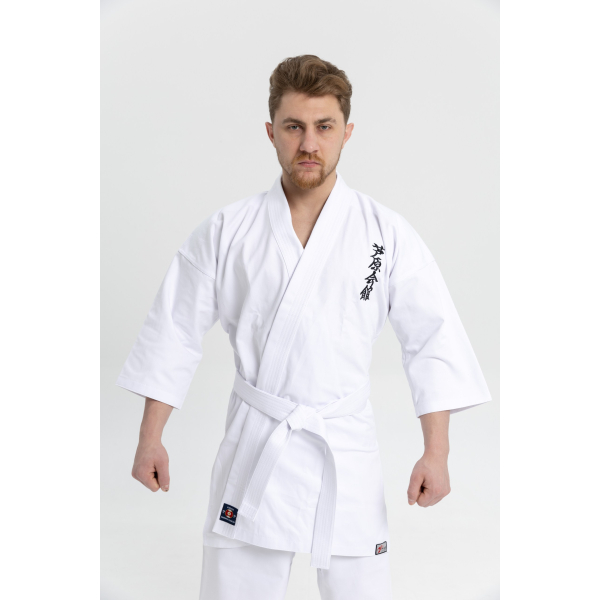 Кимоно изготовлено из прочного и приятного на ощупь х/б полотна, предварительно подвергнутого противоусадочной обработке, благодаря чему оно обладает незначительной усадкой после стирки, всего 1-2 %. Куртка имеет укороченные рукава. На левой стороне груди куртки вышиты иероглифы "Ашихара-Каратэ". Брюки с широкими штанинами имеют длину "до пола".