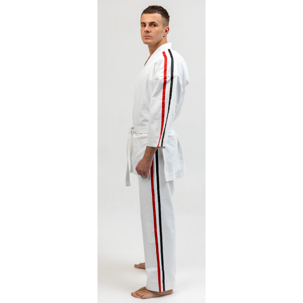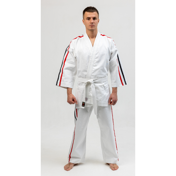 Куртка изготовлена из прочной хлопчатобумажной ткани плотностью 250-300 г/м2. Рукав укороченный. На рукава куртки и на брюки нашиты традиционные для Косики-Каратэ красные и чёрные полоски.