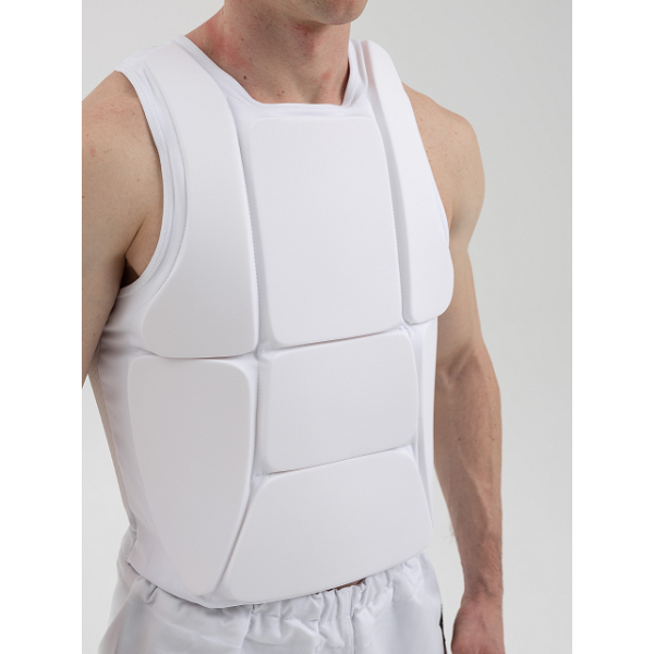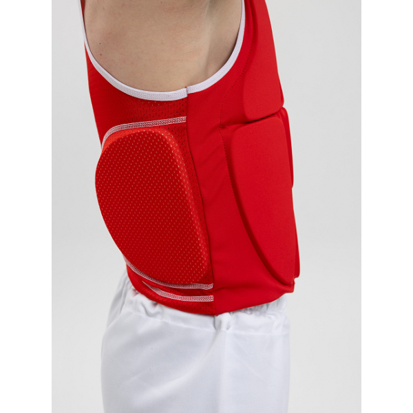 Сегментная конструкция жилета обеспечивает надежную защиту и в тоже время не ограничивает подвижность. Благодаря эластичному материалу, жилет плотно прилегает к корпусу спортсмена, а сетчатый материал задней части жилета прекрасно отводит влагу от тела и поддерживает комфорт. Защитный вкладыш жилета представляет собой раздельные сегменты из вспененного полимерного материала толщиной 15 мм.