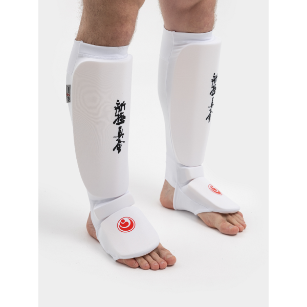 Щитки чулочной формы изготовлены из эластичного трикотажа, благодаря чему они плотно облегают ногу. Три секции защитных вкладышей толщиной 15 мм надежно защищают ударные поверхности голени и подъёма ноги и сохраняют подвижность голеностопного сустава. На передних поверхностях щитков нанесены изображения традиционных символов Синкиокусинкай.