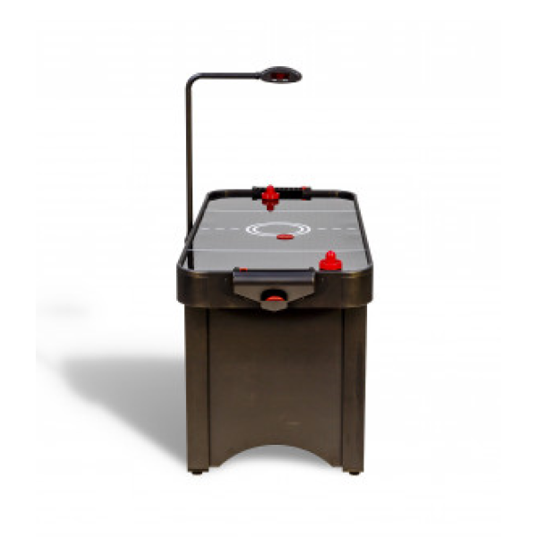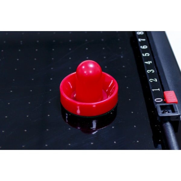 Стол оснащен электронным счетчиком очков, плюс в дополнение у каждого игрока установлен механический счетчик. Мощный вентилятор предотвращает трение шайбы об игровое поле, обеспечивая хорошую скорость и динамичность игры. Питание возможно как от адаптера 12V, так и от сети 220-240 В. В комплекте инструкция по сборке, 2 биты и 2 шайбы. Характеристики:
