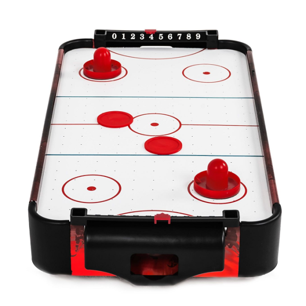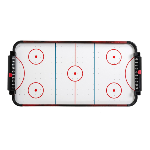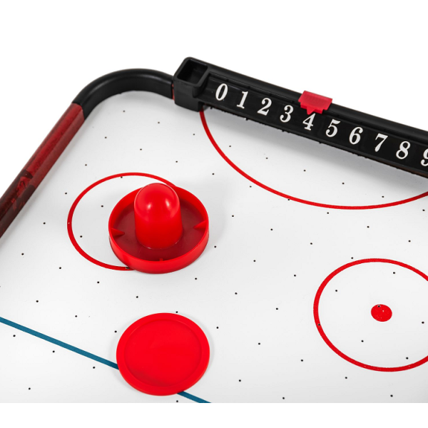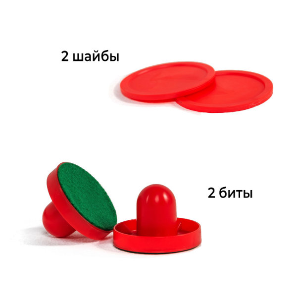 Настольная модель для домашнего использования. Механический счетчик предусмотрен возле каждого игрока для подсчета забитых шайб. В комплект входят: 2 биты и 2 шайбы размером 60 мм. Материал, из которого изготовлен стол - МДФ с пленкой. Питание вентилятора от 6 батареек типа АА (приобретаются отдельно). Характеристики: