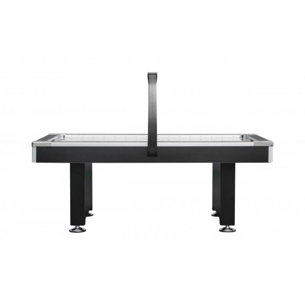 Углы стола усилены нержавеющей сталью, что полностью предотвращает их механические повреждения и придает конструкции дополнительную жесткость. Штатная шайба аэрохоккея Black Diamond обладает различной структурой игровой поверхности на каждой стороне - для ударов на силу и ударов на точность. Оборудован электронным счетчиком очков с программированием времени матча и звуковой фиксацией забитой шайбы. Для того, чтобы счет матча постоянно находился в поле зрения игроков, счетчик очков установлен на раму над игровым полем.