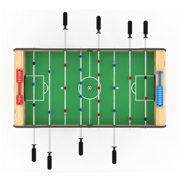 На игровой поверхности с зелёным ПВХ покрытием размером 105 х 58 см и толщиной 4,75 мм нанесена разметка под футбольное поле. 11 игроков с каждой стороны закреплены на телескопических хромированных стержнях (13 см в диаметре) с удобными рукоятками. Механический счётчик голов на обоих воротах помогает вести счёт игры.Играть в настольный футбол можно сразу после сборки стола.