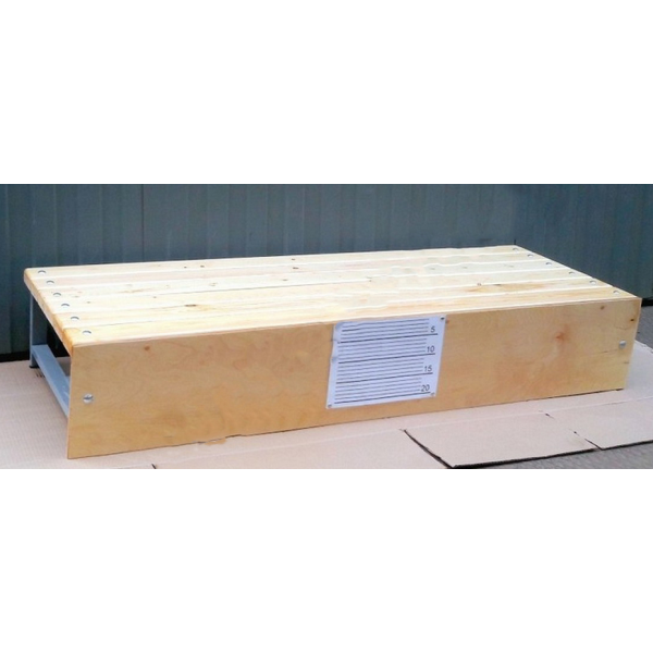 Описание: Скамья предназначена для сдачи норматива "наклон вперед" (тестирования). Снаряд состоит из стальной рамы, обшитой деревянным брусом. Порядок сдачи норматива: Наклон вперед из положения стоя с прямыми ногами выполняются из исходного положения стоя на скамье, ноги выпрямлены в коленях, ступни ног расположены параллельно на ширине 10-15см.Участник по команде выполняет два предварительных наклона, ладони двигаются вдоль линейки измерения. При третьем наклоне участник максимально наклоняется и удерживает касание линейки измерения в течение 2с. Величина гибкости измеряется в сантиметрах. Результат выше уровня скамьи определяется знаком «-», ниже знаком «+»