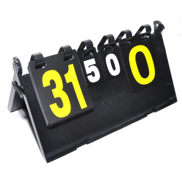 Табло для счёта перекидное отображает счёт по партиям (от 0 до 7), счёт в партии (от 0 до 31) изготовлено из пластика. Листы чёрного цвета с напечатанными белыми и жёлтыми цифрами из матового мягкого пластика на пластиковых кольцах используются для подсчёта результатов игр в волейболе, настольном теннисе и других видах спорта.