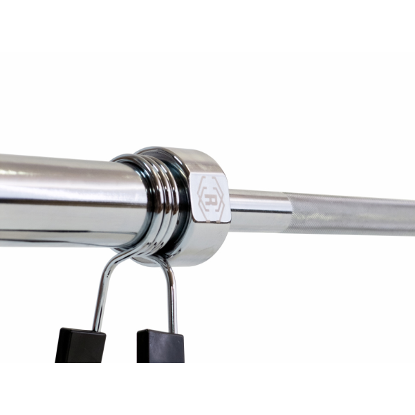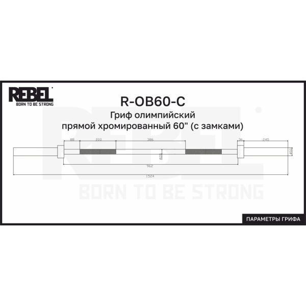 Гриф олимпийский прямой хромированный 60" REBEL R-OB60-C с пружинными замками предназначен для коммерческого или домашнего использования. Гриф имеет латунные втулки и хромированное покрытие. Максимальная нагрузка на гриф составляет 150 кг. Во избежание поломки грифа мы рекомендуем строго следить за соблюдением этого параметра. Характеристики:
