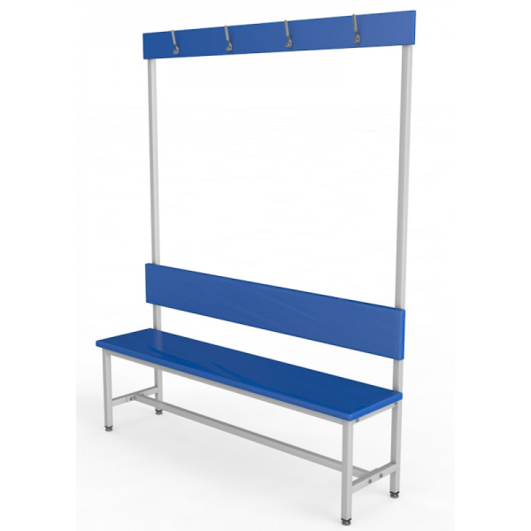 Скамейка с вешалкой для раздевалки предназначена для переодевания и хранения одежды и может быть использована в спортивных раздевалках, бассейнах, фитнес-клубах, производственных гардеробных и в помещениях с повышенной влажностью. Скамейка с вешалкой для раздевалки представляет собой неразборную металлическую конструкцию, состоящую из каркаса (профильная труба 25х25х1,5 мм.) и ЛДСП, толщиной 16 мм. Сварные швы скамейки для раздевалки тщательно обработаны и зачищены. Каркас окрашен порошковой краской. Простая и надежная конструкция. На ножки устанавливаются пластиковые заглушки. Характеристики: