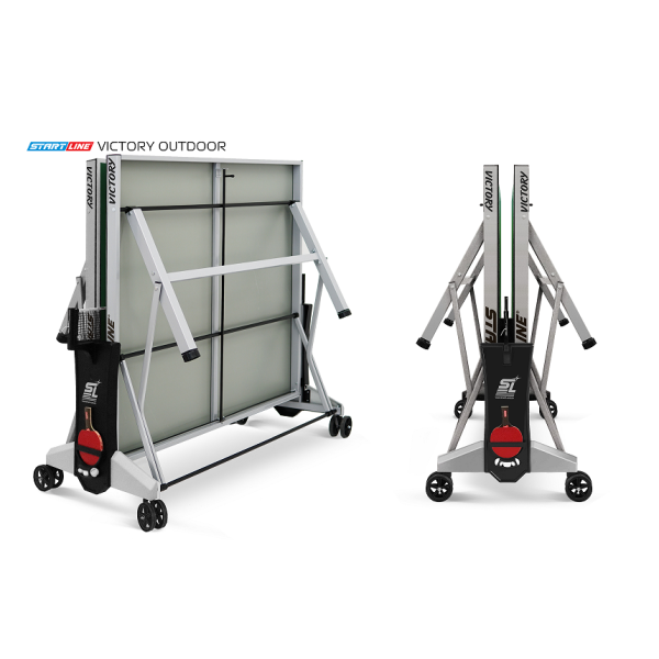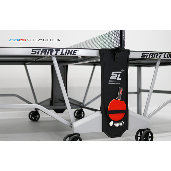Комфортная система складывания стола является собственной разработкой Start Line. Она предусматривает усовершенствованный механизм, позволяющий быстро и надежно закрепить положение стола как в разложенном, так и в сложенном виде. Все манипуляции производятся с рабочего места игрока для каждой из столешниц. Конструкция предусматривает дополнительную фиксацию в сложенном виде для безопасной транспортировки стола, а также возможность одиночной игры. Модель оснащена боковыми пеналами для хранения спортивного инвентаря, а также встроенной сеткой с натяжным механизмом. Всепогодный стол для настольного тенниса отлично подойдет для игры во дворе загородного дома, дачи, зоны активного досуга на базе отдыха или спортивной площадке. Характеристики:
