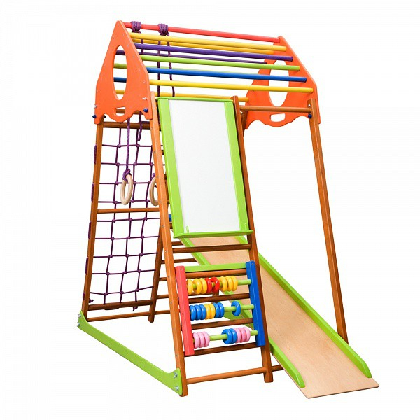 Все эти спортивные атрибуты способствуют развитию ловкости и силы малыша, его мелкой моторики, реакции и координации движений. А оригинальные игровые элементы помогут развить логику, математические способности и художественные навыки ребенка. К ним относятся: яркие оригинальные счеты; двухсторонний мольберт с белой и черной основой, что позволяет рисовать на нем и мелками, и маркерами.