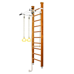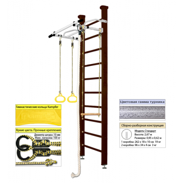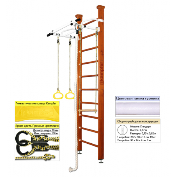 Конструкция выполнена из натурального дерева, все края деталей немного скруглены обеспечивая большую безопасность для ребенка. Крепление враспор между потолком и полом удобно тем, что подходит для любых стен, и комплекс можно передвигать с места на место. Но потолок не должен быть из хрупких материалов, таких как гипсокартон (навесные) и вагонка, для них лучше подойдут пристенные модели. Комплектация:
