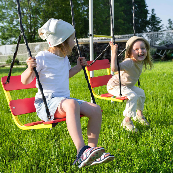 Дачный спортивный комплекс ROMANA «Акробат-2» — многофункциональный тренажер для дачи или загородного дома, с большим количеством элементов. С помощью комплекса ROMANA «Акробат-2» дети развивают координацию, ловкость и силу, а также могут просто весело проводить время на воздухе во время поездок на природу. Рукоход, турник, канат для лазания, кольца и кольца с перекладиной, а также щит для игры в баскетбол — мы учли все любимые занятия маленьких непосед. Турник можно перемещать по вертикали, он закрепляется хомутами на любой высоте лестницы рукохода. Все оптимизируется под желание владельца. Навеска устойчива к атмосферному воздействию и в летнее время ее можно не заносить в дом после игр. В комплексе предусмотрены сразу двое качелей — дети не будут спорить за право покататься первым и могут веселиться вместе. Характеристики: