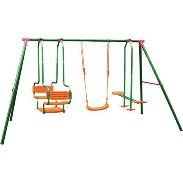 Детский уличный игровой комплекс состоит из трех разных качелей: качелей веревочных, гондолы и двухместных качелей Регулируемые веревки для качелей подходит для детей: 3-10 лет.