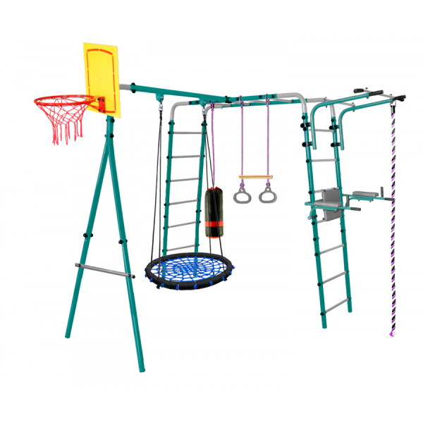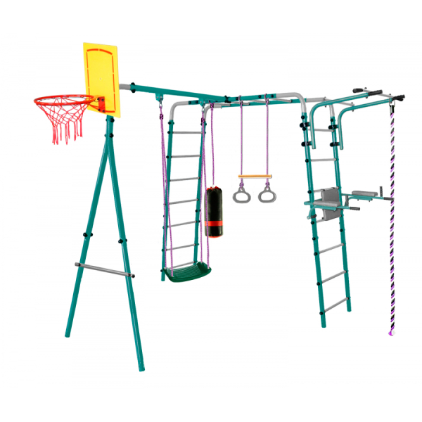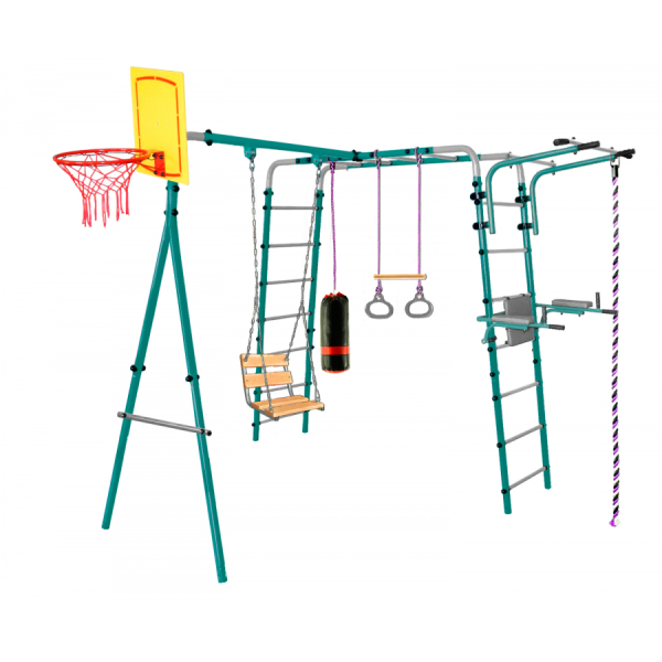 Этот спортивный комплекс показывает разнообразие модельного ряда продукции Midzumi. Прочная металлическая конструкция позволяет выдерживать до 100 кг. Крепление Комплекса осуществляется с помощью бетонирования. Midzumi Hanabi Universal состоит из каркаса двух металлических лестниц с рукоходом, передвижного турника, навесных цепных качелей, каната и колец с перекладиной, баскетбольного щита, брусьев откидных со спинкой и детской боксерской грушей. Качественные материалы изготовления надолго сохраняют яркость цвета и рассчитаны на любые погодные условия, устойчивы к попаданию прямых солнечных лучей, морозу, дождю и перепадам температур, прослужат долго даже при самом интенсивном использовании. Характеристики: