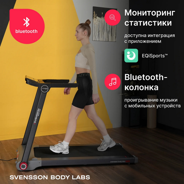 Описание: Беговая дорожка SVENSSON BODY LABS LIBRA — это надёжное решение для тех, кто хочет поддерживать физическую активность в домашних условиях. С максимальной нагрузкой до 130 кг. и мощным двигателем 2.25 л.с. (пиковая мощность 4,4 л.с.), данная модель обеспечивает плавный и комфортный бег с диапазоном скорости от 1 до 15 км/ч., что позволяет пользователям адаптировать тренировки под свои индивидуальные потребности, начиная с легкой разминки и заканчивая интенсивными пробежками.