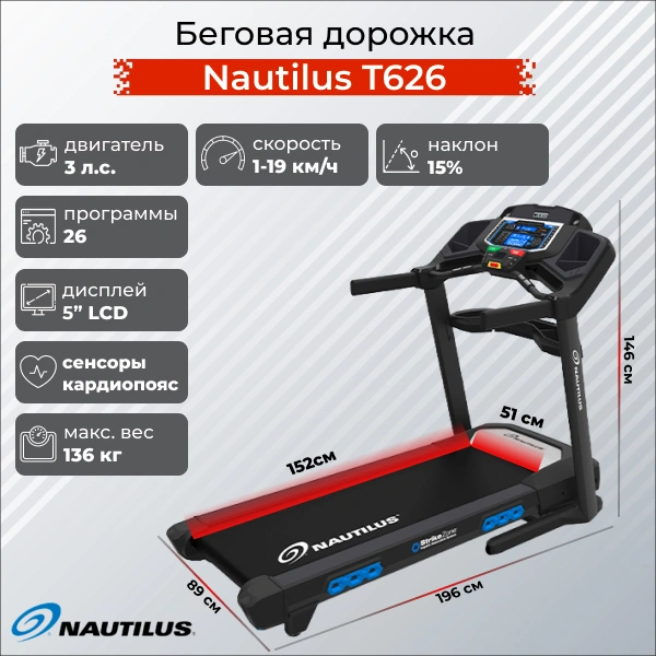 Описание: Американская компания Nautilus вдохновленная своей клубной линейкой беговых дорожек разработала Беговую дорожку Nautilus T626 для домашнего пользования позволяет эффективно тренироваться в домашних условиях. Надежный двигатель 3.0 л.с с максимальной скоростью 19 км/ч. и угол наклона до 15% позволяют серьезно нагрузить сердечнососудистую систему и дают дополнительную силовую нагрузку на мышцы, а это оценят даже профессионалы.