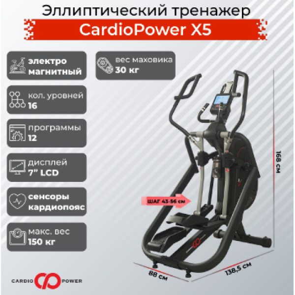 Описание: Эллиптический тренажер CardioPower X5 - инновационный эллиптический тренажер с регулируемой длиной шага и самой совершенной биомеханикой движения среди аналогов. Запатентованная система движения Smart Suspension System создает непревзойденные ощущения плавности и естественности хода, при этом обеспечивая высокую эффективность тренировок с максимальным вовлечением в работу мышц как нижней части тела, так и мышц верхнего плечевого пояса и рук.