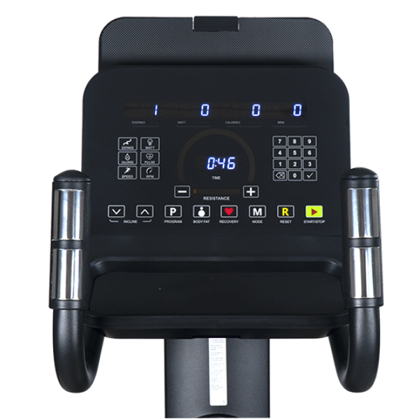 Время, дистанция, RPM (количество движений в минуту), уровень сопротивления, расчет калорий, пульс (ЧСС)