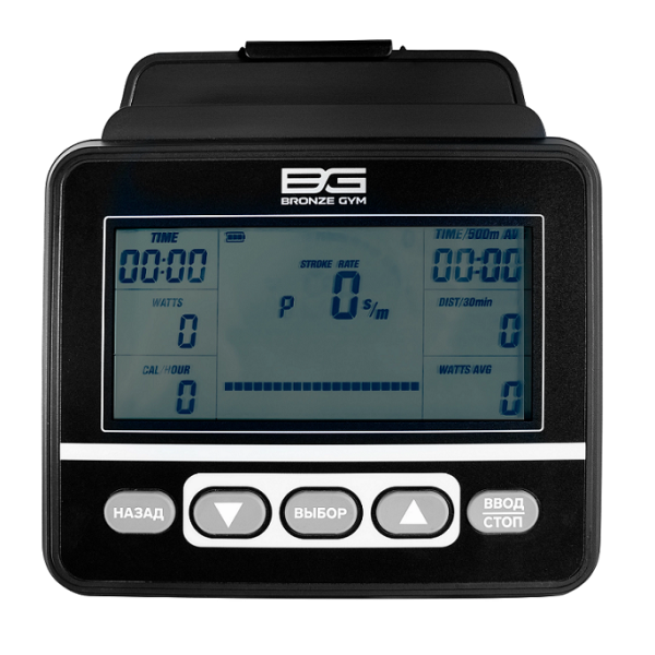 • Показания консоли: время тренировки, пройденная дистанция, расход калорий, пульс, количество гребков в минуту, мощность в Вт, средняя мощность в Вт, циклы тренировки;