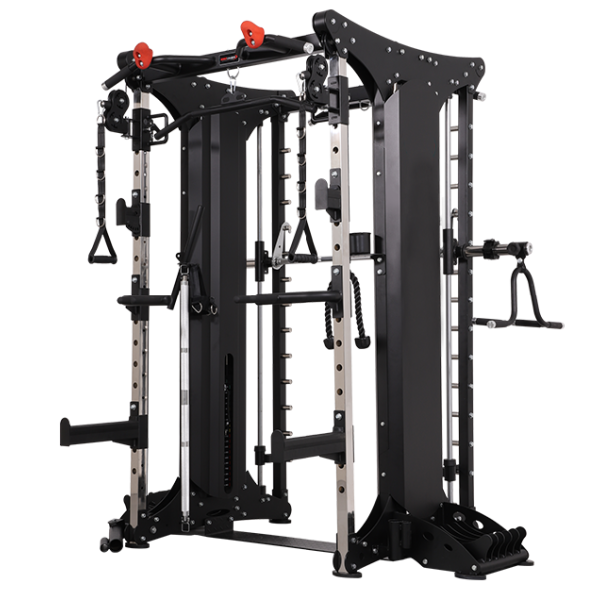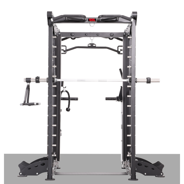 Машина Смита мультикомплекса имеет встроенный несъёмный гриф со страховочными захватами, перемещающийся в вертикальной плоскости на линейных подшипниках по цельнометаллическим каленым направляющим. Количество положений фиксации грифа в вертикальной плоскости - 12.