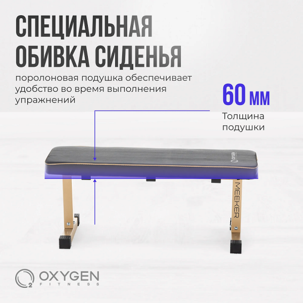 Описание: Скамья cиловая прямая Oxygen Fitness MEEKER разработана для эффективных тренировок со свободными весами. Устойчивая надёжная конструкция позволяет безопасно выполнять силовые упражнения. Высота скамьи полностью соответствует биомеханике человеческого тела и обеспечивает пользователям разного роста правильный и удобный упор ног при выполнении упражнений. Ширина скамьи гарантирует полную поддержку спины. Характеристики: