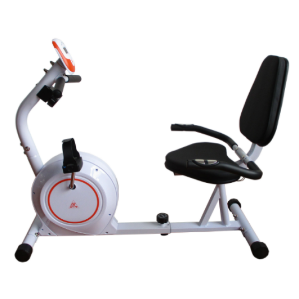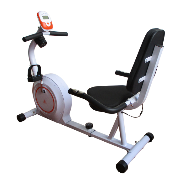 Горизонтальный велотренажер для домашнего использования. Магнитная нагрузка с механической регулировкой, ручная регулировка изменения нагрузки с помощью рукоятки на стойке тренажера. Датчики пульса расположены на удобных поручнях по краям кресла. Большое сиденье со спинкой для людей разного возраста регулируемой по длине с помощью рамы. Аккуратная консоль с LCD-дисплеем компьютера (питание от 2 батареек ААА). Показания компьютера: время, скорость, дистанция, калории, скан, пульс.