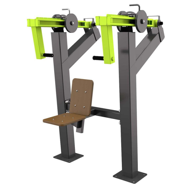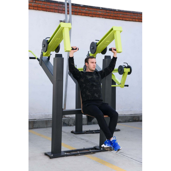 Уличный тренажер "Жим вверх с переменной нагрузкой" предназначен для функциональных тренировок на открытом воздухе. Жим сидя является одним из базовых упражнений, которое позволяет интенсивно нагружать дельтовидные мышцы, формируя тем самым внушительный рельеф передних и средних дельт.